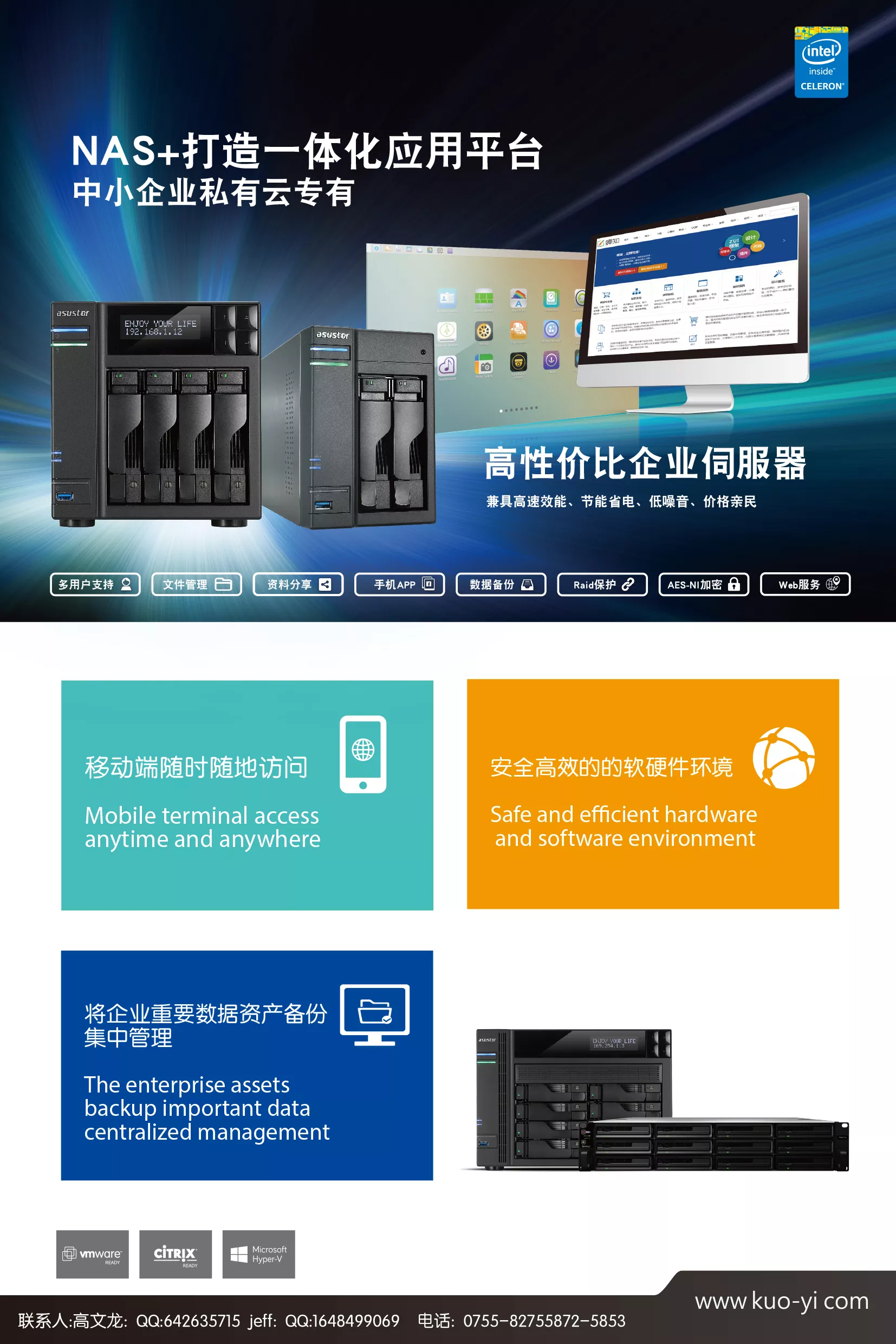 NAS在解决传统的文件集中存储、备份、管理的同时,支持由易软天创网络科技有限公司开发的基于B/S架构的禅道、蝉知、然之三个专业企业应用软件,从而为企业提供一个兼顾存储与专业应用的高性价比的解决方案。