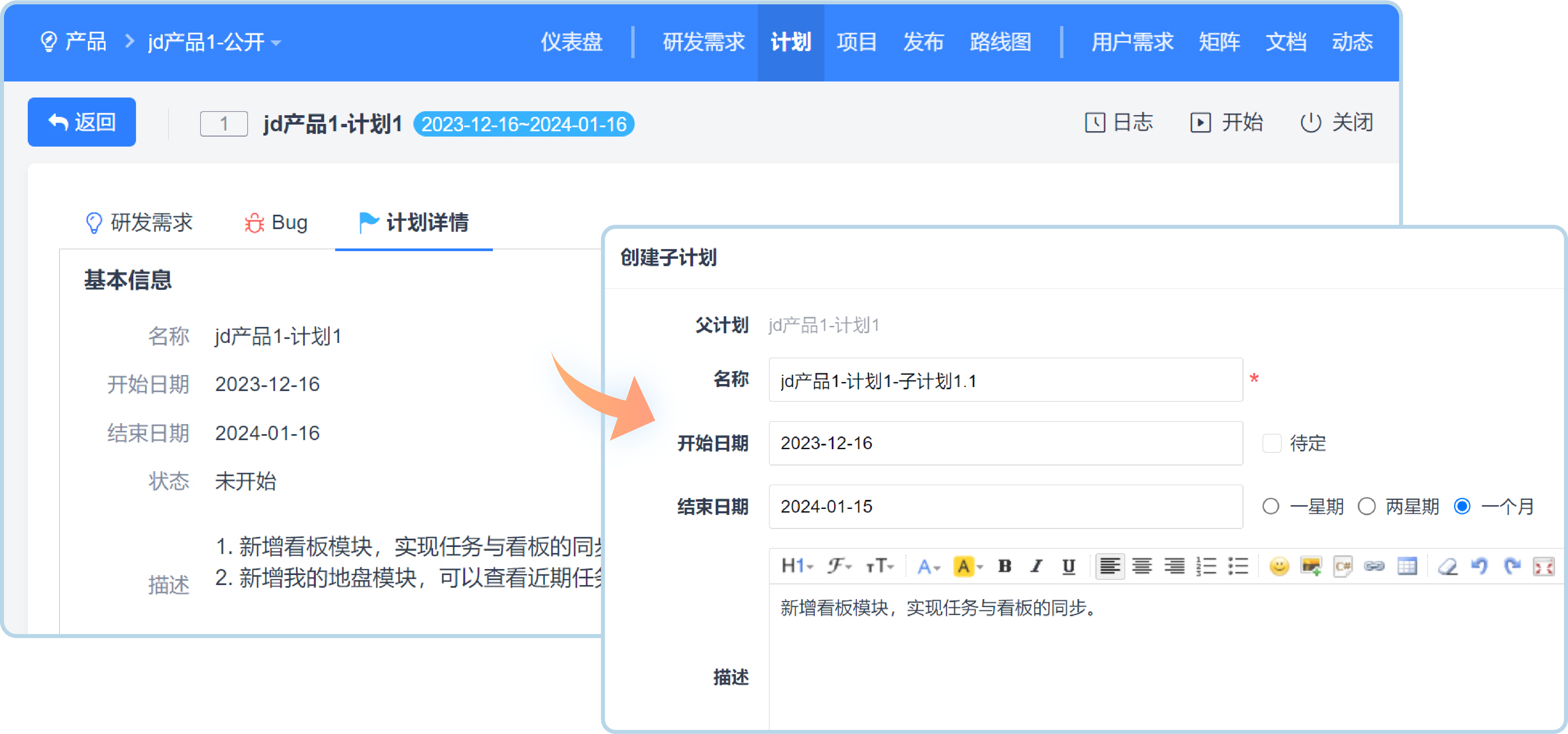 辅助拆分产品子计划,便于对产品进行系统梳理,及时跟进短期计划的实施进度、状态。