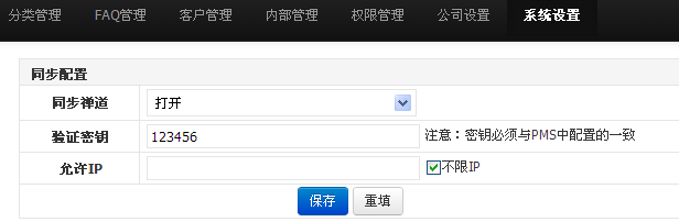 7、如果想跟他禅道实现同步,则要在“系统设置”中将“同步PMS”打开,为了安全,后设置一下验证密钥。 同时,要在pms的“反馈视图——设置配置”加入要同步的Ztrack地址和验证密钥。注:两个密钥必须一致,否则无法同步。
