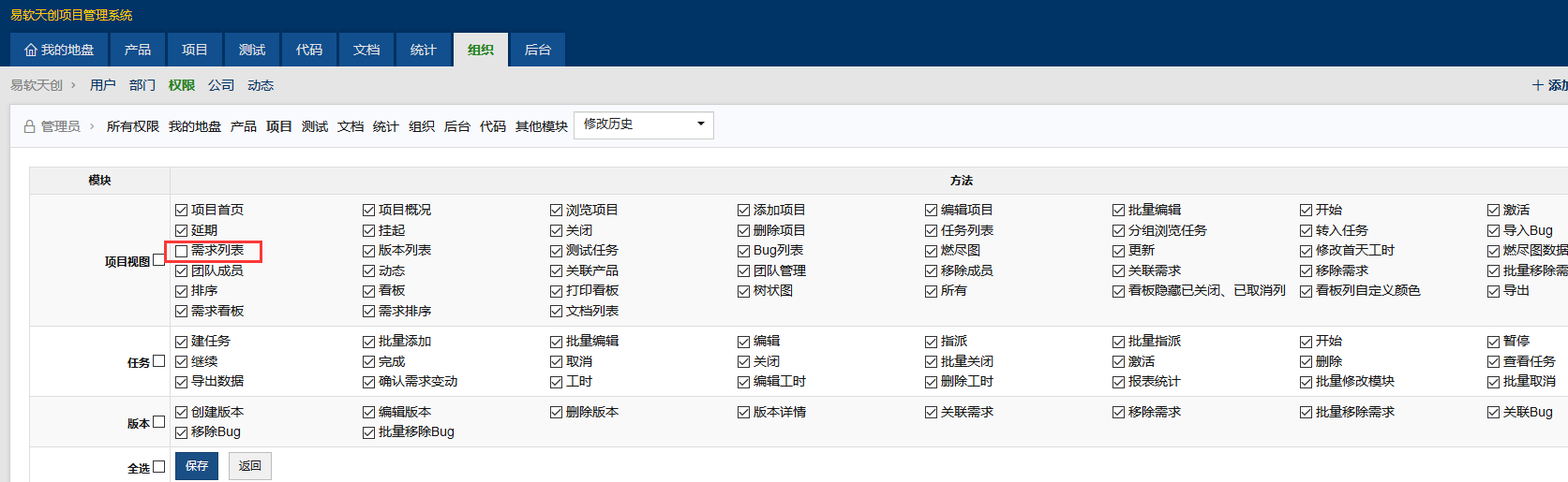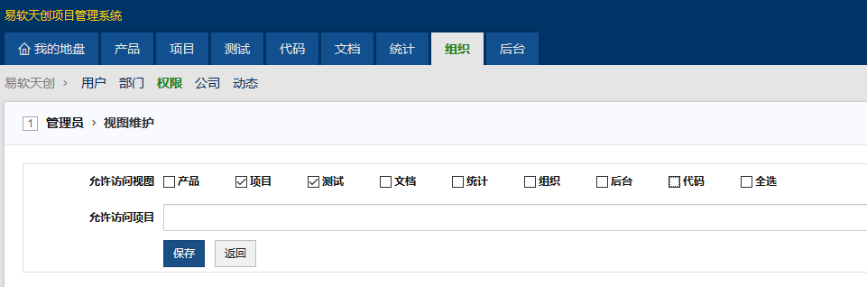 🚢 可以在组织-权限,编辑权限分组的视图维护,只勾选项目、测试。