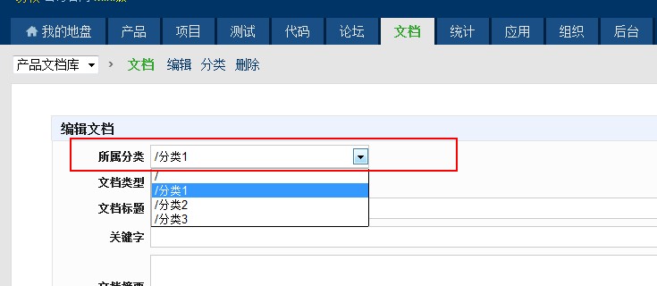 内容:文档管理,产品文档库,创建文档后,再编辑,视图中无法改变所属分类。