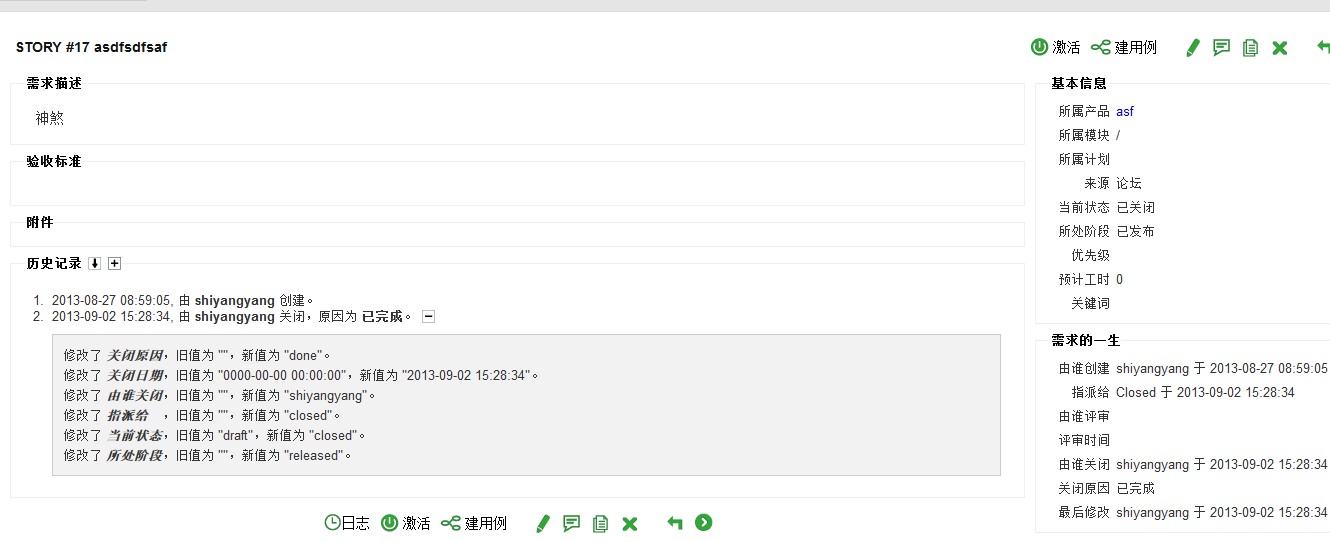 2013-04-02 15:47:39, 由 丁艺红 创建。 2013-04-02 18:08:51, 由 丁艺红 关联到项目 8。 2013-04-16 20:26:14, 由 杜双军 关闭,原因为 已完成。 修改了 关闭原因,旧值为 "",新值为 "done"。 修改了 关闭日期,旧值为 "0000-00-00 00:00:00",新值为 "2013-04-16 20:26:14"。 修改了 由谁关闭,旧值为 "",新值为 "dushuangjun"。 修改了 指派给 ,旧值为 "dingyihong",新值为 "closed"。 修改了 当前状态,旧值为 "active",新值为 "closed"。 修改了 所处阶段,旧值为 "developed",新值为 "released"。