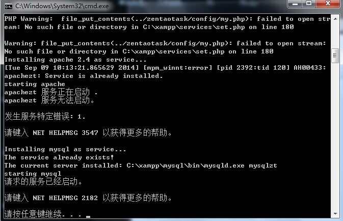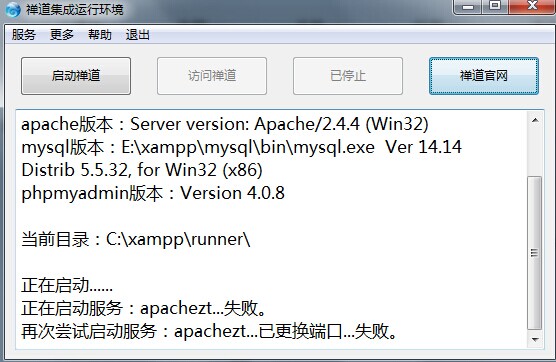 我是在win7系统上安装的最新版一键式安装包,在启动控制面板的时候,apachezt总是启动不成功,使用管理员运行启动也是不行。