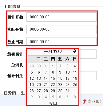 选择某一个已经开始或存在的项目任务时,右侧的【工时信息】中的【预计开始】、【实际开始】、【截止日期】问题,点击任何一个都显示时间从1970年1月开始,怎么样能够可以让这部分的时间可以自动显示成当前年月日