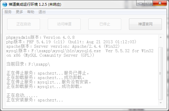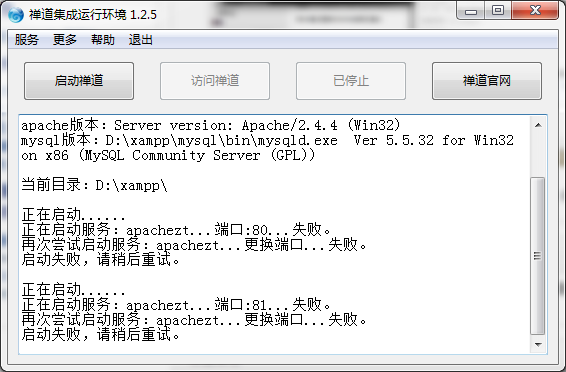 第一次解压缩到d盘某目录下,无法启动后,删除,重新解压缩到e盘根目录,但是启动后也是停滞在当前图片中,使用start.bat方式如图所示,mysql能够启动,但是apache总提示有问题。每次重启都提示vc没有安装,每次都是repair,启动后