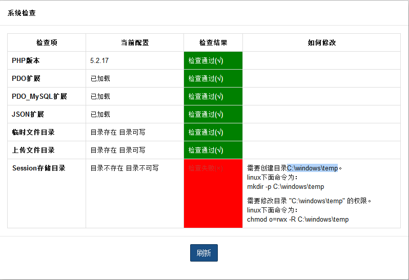 部署源码包的时候,第二步,系统检查时候,出现Session存储目录/目录不存在 目录不可写的提示。