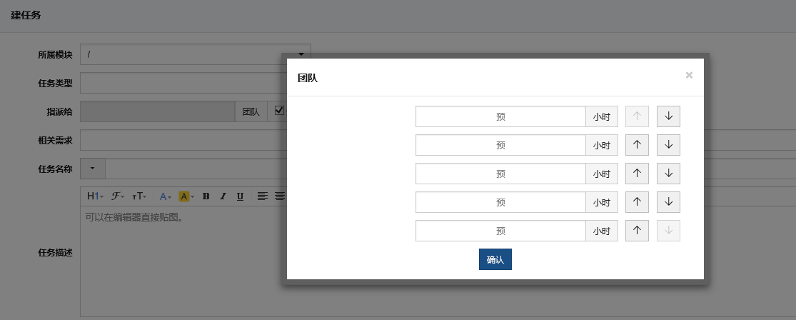 2、创建任务页面,勾选“多人”后点击“团队”,弹出页面不显示人员列,只有预计时间列。