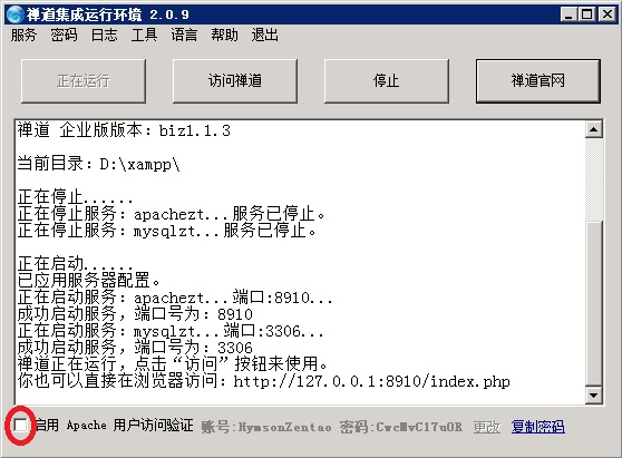 如图中左下角红圈勾选框选项所指, 取消此勾选-->停止禅道-->再启动运行,即可