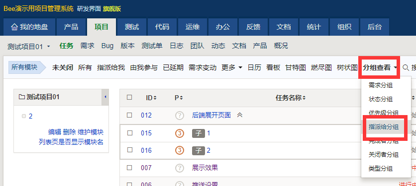 禅道-李锡碧2018-06-06 15:35:34 可以试试项目-任务列表,点击下分组查看,选择指派给分组。
