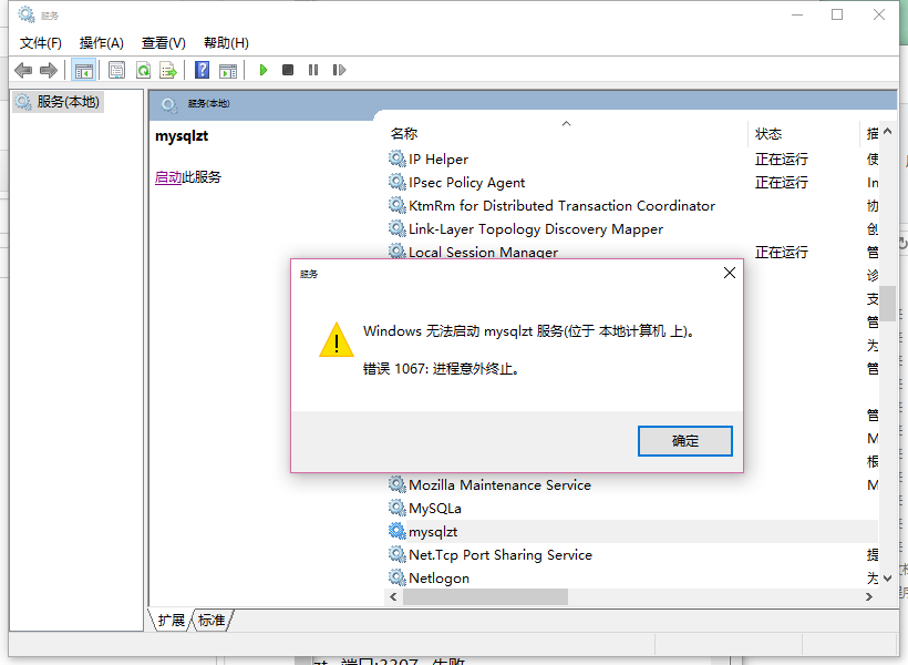 3、在本地服务中手动启动mysqlzt服务。提示无法启动,错误为1067,如图