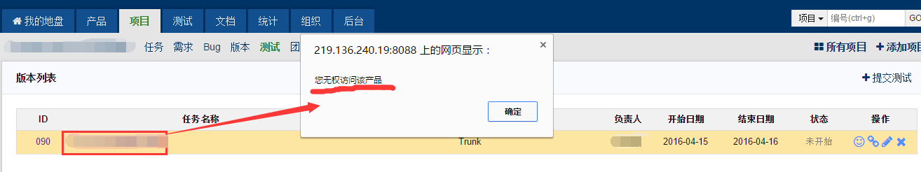 开发提测过来的任务单,有时候点击会提示无权访问该产品,如下图: