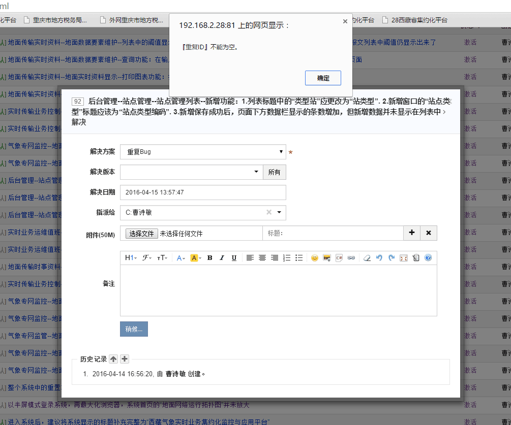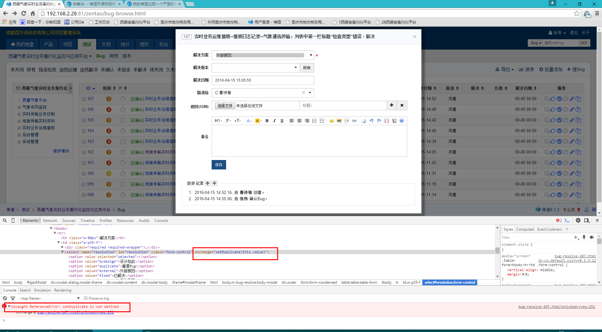 提交一个重复BUG,点击解决,解决方案选择重复BUG,之后不会弹出选择重复BUG ID的输入框了,换浏览器、重启、重启服务都试过不行,应该是代码问题,麻烦大神来看看,谢谢了!