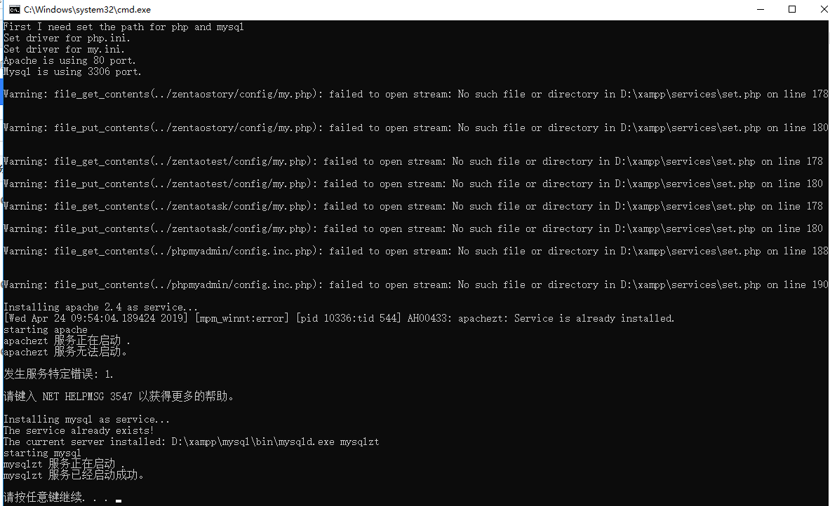 进入xampp\service目录,双击运行install.bat,apache服务无法启动,请问要怎么处理?