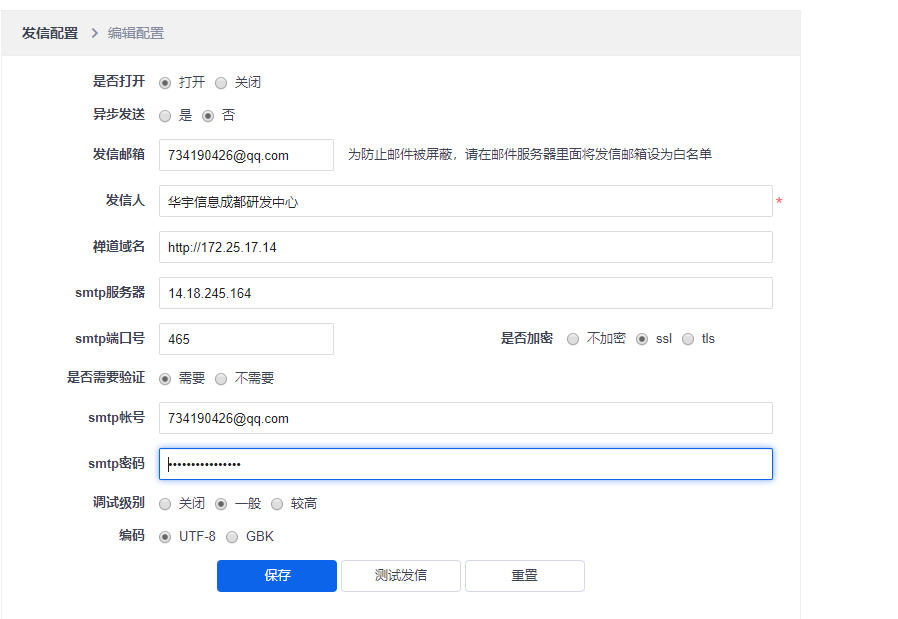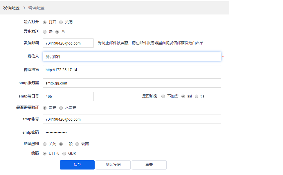 按照文档说明配置邮箱设置如下: