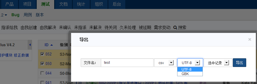 在“测试”-->"bug"下导出cvs文档,选中UTF-8导出的文档显示乱码;如果选择GBK导出,则电脑简体中文环境显示正常,电脑是繁体中文则也显示乱码。