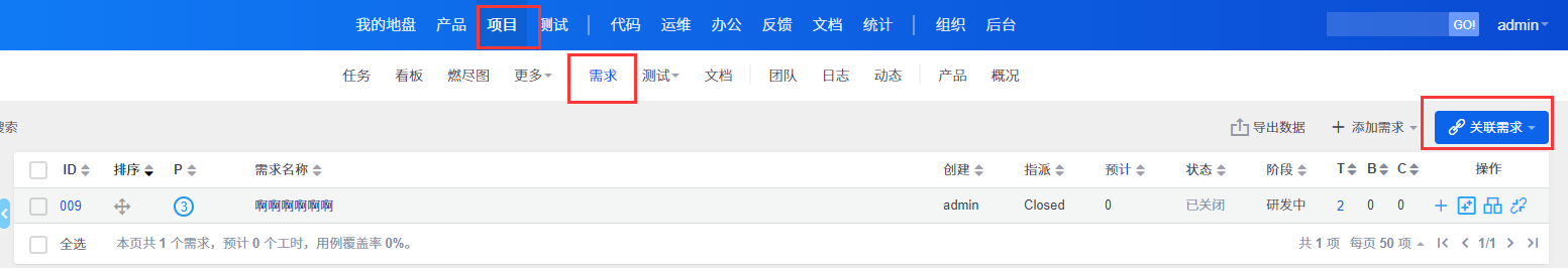 🥂 在项目--需求页面关联需求。如果没有这个按钮,可以在组织--权限--权限维护,分配相应权限后重新登录看一下。 |