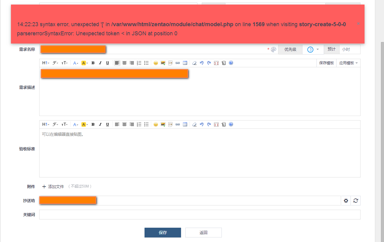 创建一个需求或任务时提示:syntax error,unexpected,再次点击保存就可以(会提示存在同名需求或任务)