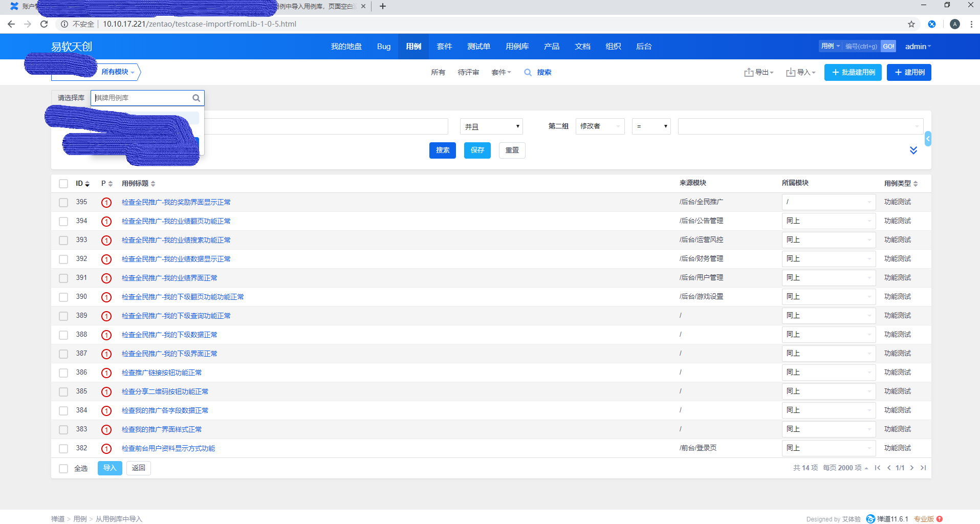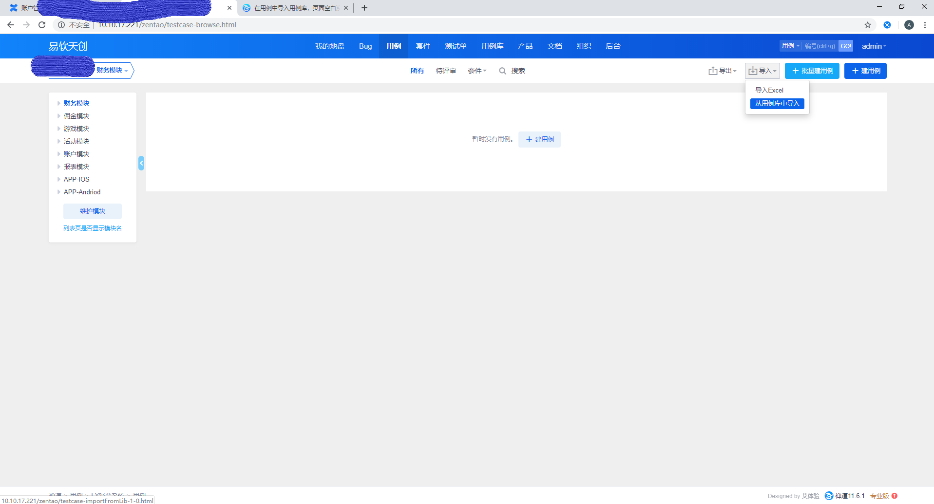 在用例中,选择项目,然后选择从用例库导入,页面空白,没反应http://10.10.17.221/zentao/testcase-importFromLib-1-0-1.html
