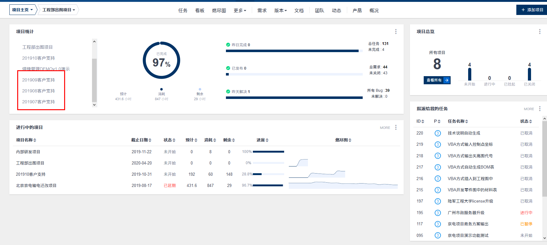 3.在项目统计界面,任何账号可见已经关闭项目,并且可以打开,查看项目任务信息
