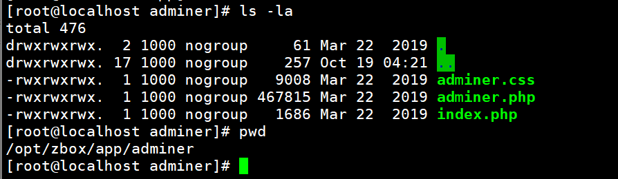 石洋洋2019-11-19 15:56:33 到服务器上检查一下/opt/zbox/app/adminer/下面的文件是否都存在,读写权限是否正确: