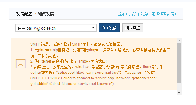 36847邮件配置失败,ERROR: Failed to connect to server: php_network_getaddresses: getaddrinfo failed: Name or service not known (0) 已解决