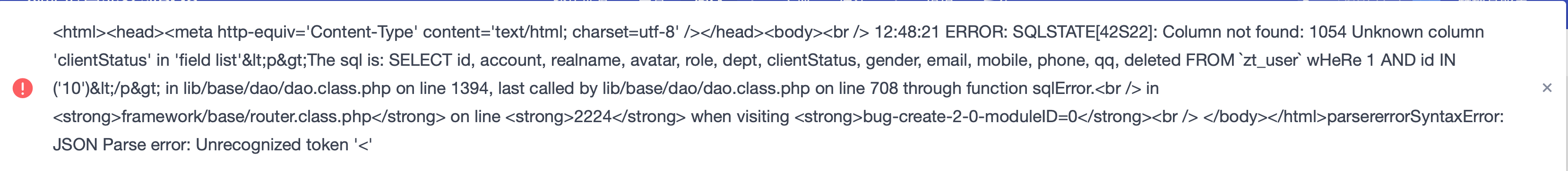 <html><head><meta http-equiv='Content-Type' content='text/html; charset=utf-8' /></head><body><br /> 12:48:58 ERROR: SQLSTATE[42S22]: Column not found: 1054 Unknown column 'clientStatus' in 'field list'<p>The sql is: SELECT id, account, realname, avatar, role, dept, clientStatus, gender, email, mobile, phone, qq, deleted FROM `zt_user` wHeRe 1 AND id IN ('10')</p> in lib/base/dao/dao.class.php on line 1394, last called by lib/base/dao/dao.class.php on line 708 through function sqlError.<br /> in <strong>framework/base/router.class.php</strong> on line <strong>2224</strong> when visiting <strong>bug-create-2-0-moduleID=0</strong><br /> </body></html>parsererrorSyntaxError: JSON Parse error: Unrecognized token '<'