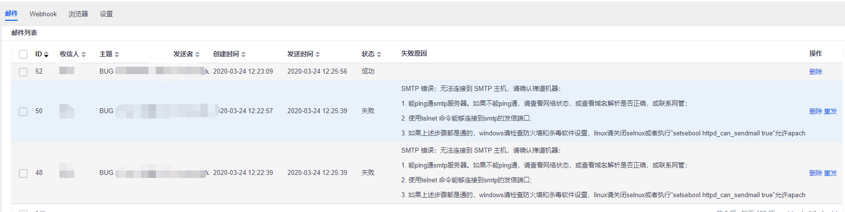 配置了邮箱后测试发信是可以的,邮箱能收到,但是一旦提BUG ,更新BUG,就不会收到邮件,然后从邮件的列表里查看,有一些发送失败的邮件,点击重新发送,就可以收到邮件,如图: