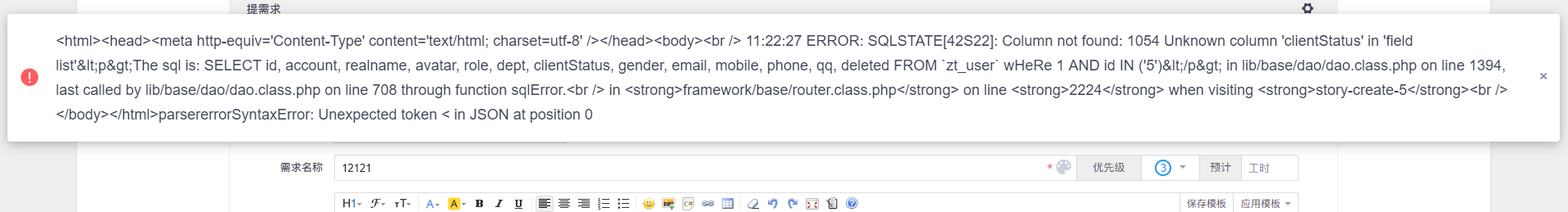 禅道-李锡碧2020-03-28 11:17:33 不好意思,之前一键安装包部署12.1版本这块有问题,数据库缺少字段,除clientStatus之外,可能还有其他字段缺失。可以参考 /opt/zbox/app/zentao/db/xuanxuan.sql 中的脚本确认下, 如何访问数据库参考: 另外,如果遇到其他问题,可以联系官网顶部的商务QQ,邀请加入技术交流群,群里沟通下。 |