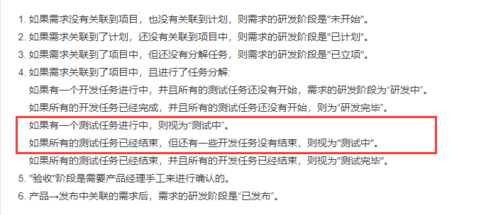 ⛄ 可以参考一下需求阶段的手册,只有测试类型的任务开始后状态变为进行中,需求阶段才会变为测试中。 |
