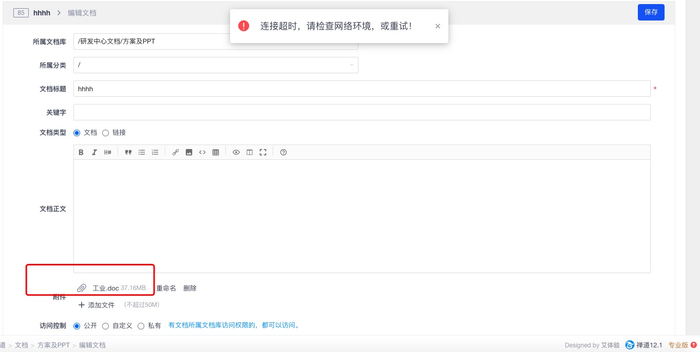 您好,请教个问题,就是我在保存文档时,当附件过大时会报错,提示链接超时,版本为开源版12.1,请问这个是什么问题,附件最大为50m,上传的才37m。