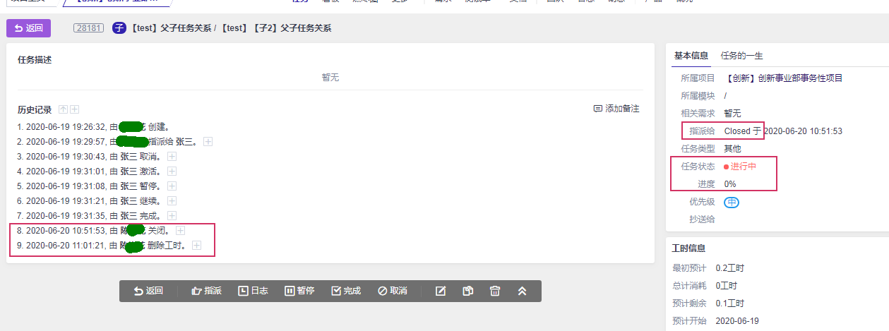 将已关闭任务的日志删除了,任务自动变为进行中,但是当前指派为什么是closed已解决