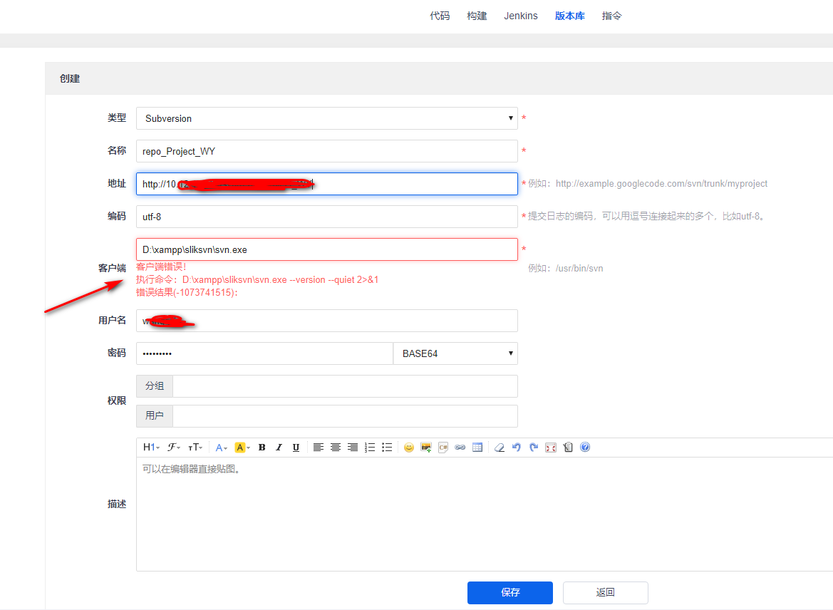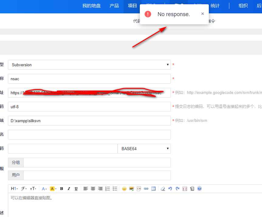 禅道集成版本库输入相关信息保存后提示如下,然后保存按钮置灰了。