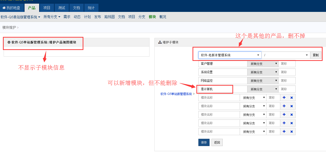 产品下的“模块维护”中,包含了另一个产品。 模块维护功能之后不可用,只能新增,不能删除已解决