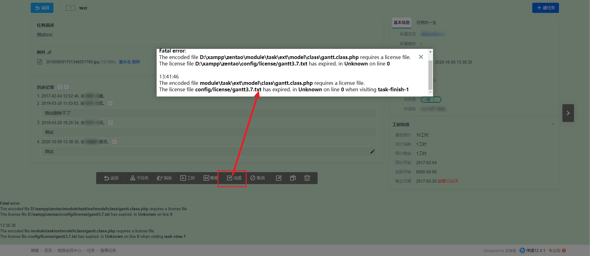 禅道安装了试用的甘特图插件过期后,任务点击【完成】报错,已尝试禁用、卸载和清除插件