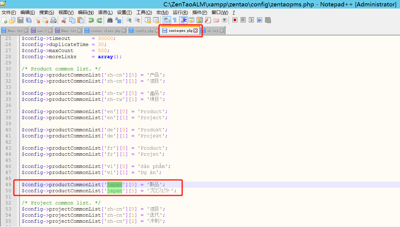 在“\xampp\zentao\config\zentaopms.php”文件中加入自定义语言的相应定义