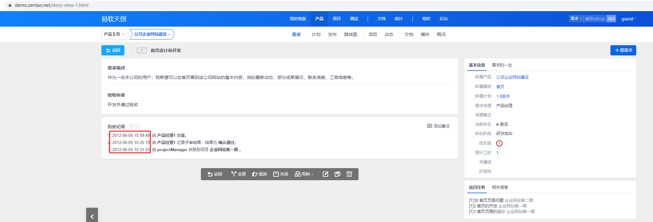 石洋洋2020-12-28 13:29:07 贵公司是否修改过禅道的代码?禅道演示站点上时间的记录是正常的: