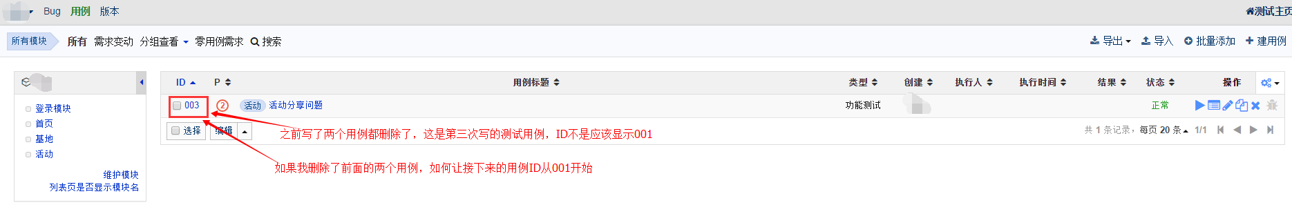步骤:我先写两个测试用例,用例ID分别是001和002,然后我在删除两个用例,重新写测试用例,编号为003,不是应该是001吗?如何让编号变成001?后台回收站的用例又没法删除,难道用例没有彻底删除吗?如果是没有彻底删除,那如何操作呢?