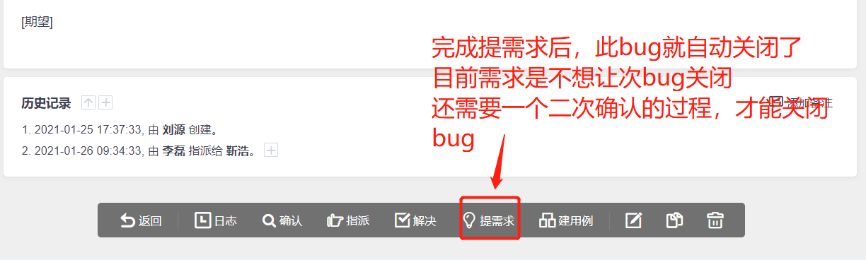 禅道-李锡碧2021-01-26 13:54:02 禅道设计逻辑: bug提需求之后,后续的事项在需求进行跟踪就好,bug自动关闭,解决方案是转需求。 需要调整的话,可以修改代码实现,可以参考文档: |