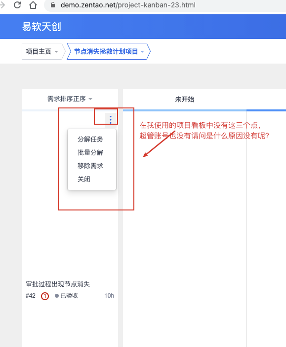 在项目视频中,demo在项目看板视图中有三个点,点击后,可以在看板中快速分解任务,但是我使用的看板中没有,请问是版本问题还是设置问题已解决