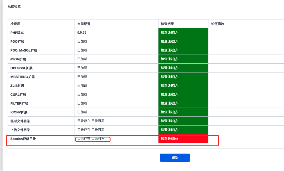请问,我修改了PHP.ini的session.savepath, 也设置了目录读写权限,安装时显示 目录存在,目录可写,可为何 检测不通过呢?已解决