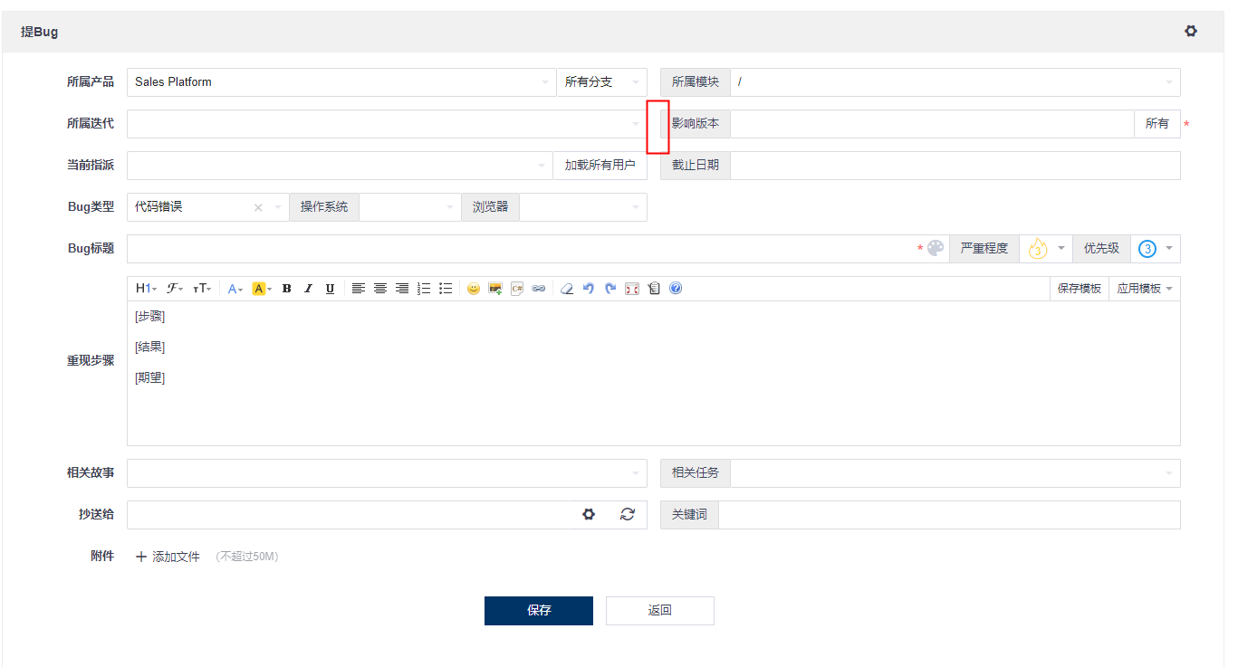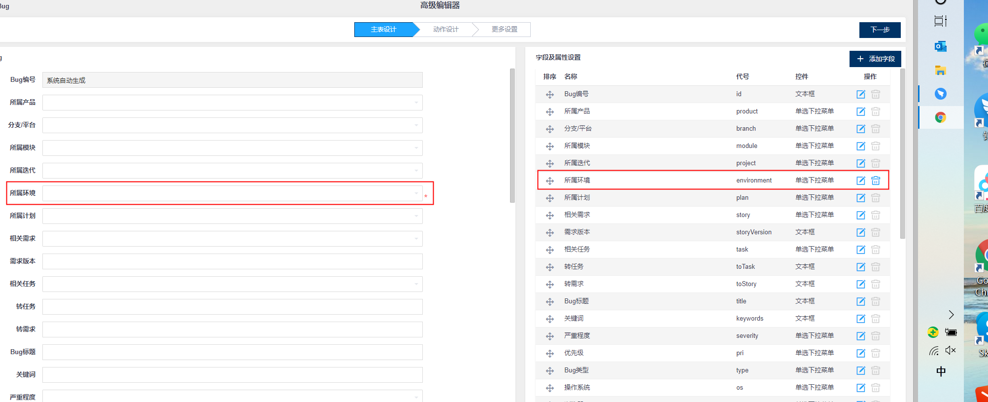 在“工作流”修改“Bug”设计,新增字段“所属环境”: