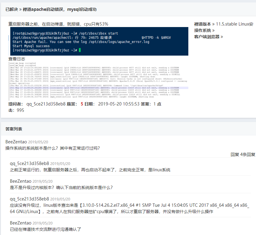 目前我也是遇到同样的问题,服务器被植入了挖矿程序,把挖矿程序清理掉后服务器重新启动了一下。然后禅道就出问题了,apache不能启动,mysql能启动。跪求!~