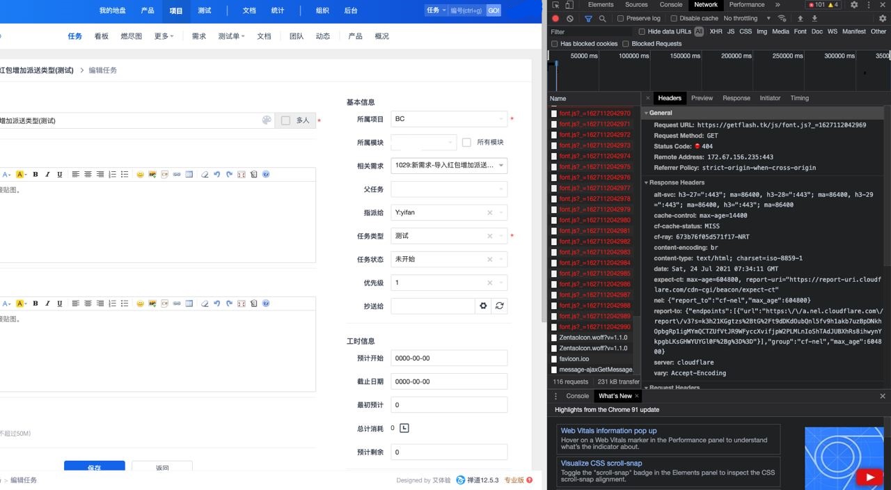 在bug项目里点编辑时会请求 https://getflash.tk/js/font.js 这个js字体文件,但是这个页面目前是404的状态,并且请求失败后会一直频繁重复的去请求,导致其他请问响应非常慢。