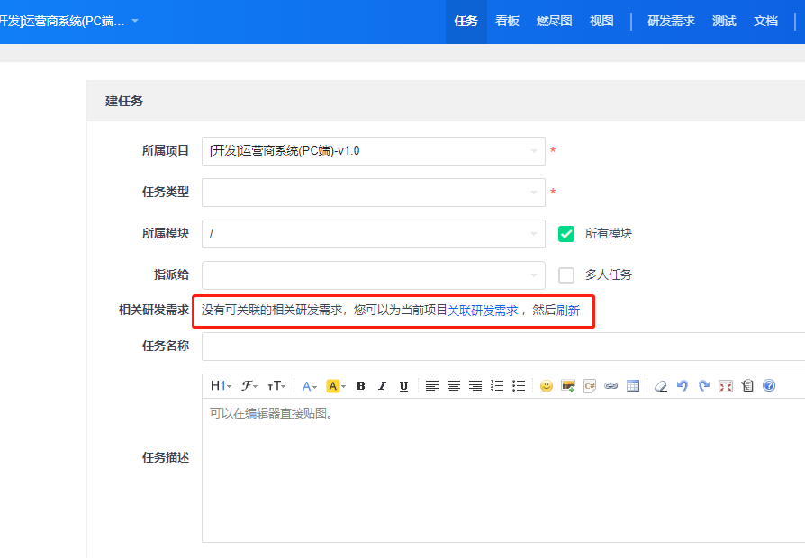 2,但在该项目,新建任务页面,【相关研发需求】字段提示没有可关联的相关研发需求