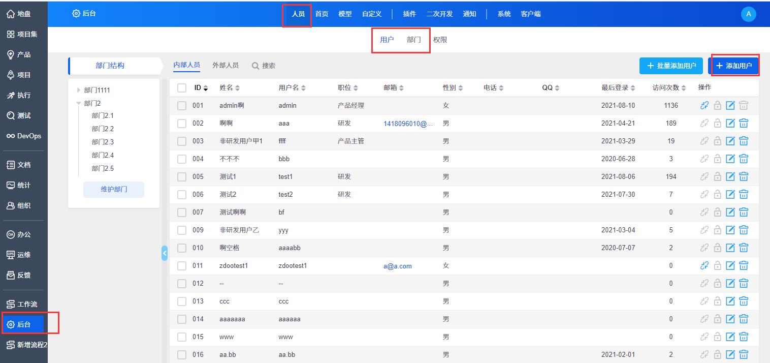 🥂 新版本在后台--人员--用户页面添加新用户。后台--人员--部门页面维护部门结构。