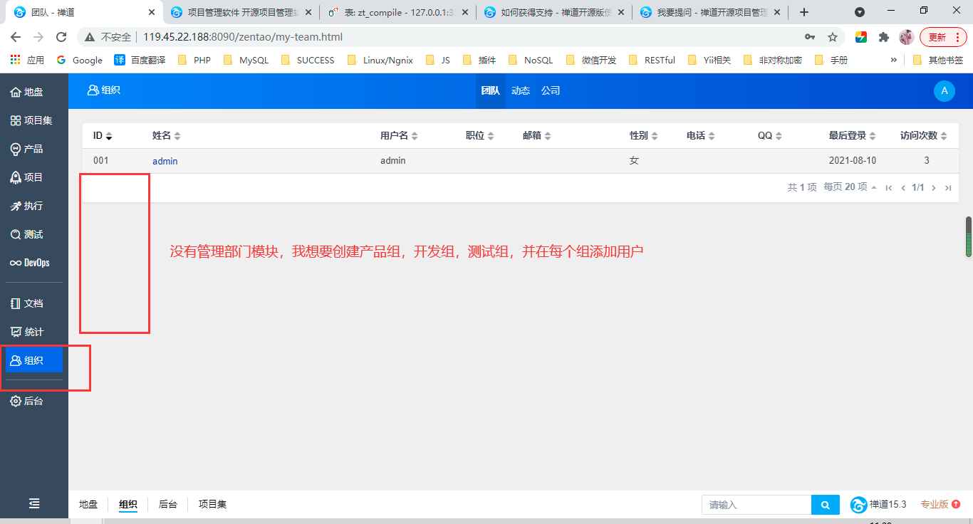 禅道15.3版本在组织页面没有找到维护部门功能,不能创建其他用户已解决