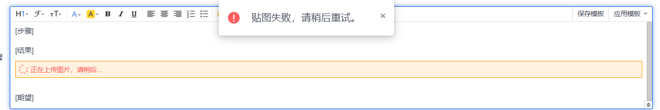 提BUG页面,在结果一栏粘贴的图片,提示贴图失败,无法上传