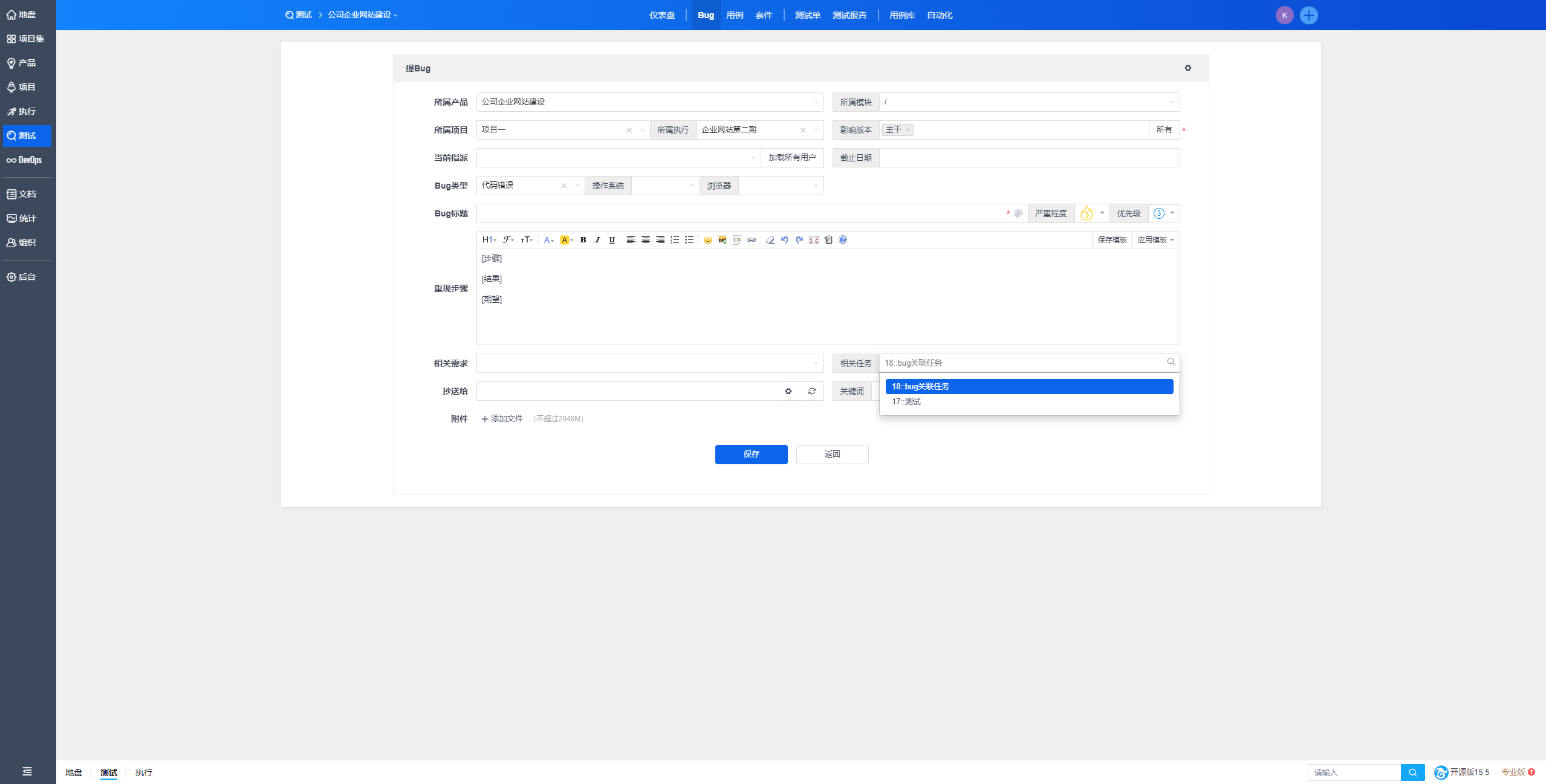 🚍 您好!bug关联任务的前提需要先指定所属项目和所属执行,因为任务是在执行下创建的,如下图所示。希望对您有帮助!
