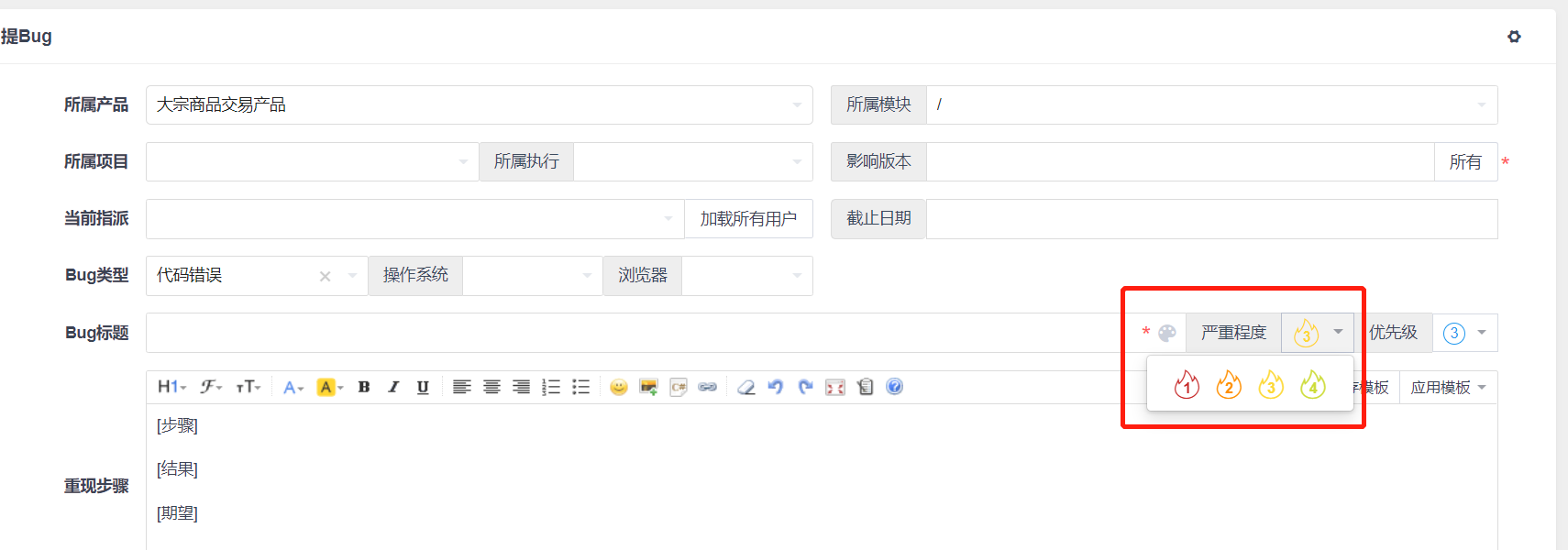 🚍 您好!设置位置:后台-自定义-Bug-严重程度,修改保存就可以了。 |