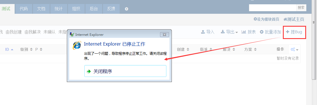 点击“测试”下的“+提bug”,系统挂掉,如下图。系统版本:window一键安装包,最新专业版本;浏览器版本:IE8